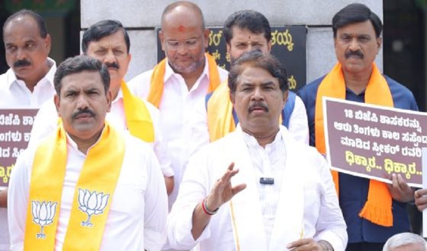ಬಿಜೆಪಿಯ 18 ಶಾಸಕರನ್ನು ಆರು ತಿಂಗಳ ಕಾಲ ಅಮಾನತು ಮಾಡಿದ ಕ್ರಮವನ್ನು ಖಂಡಿಸಿ ಬೆಂಗಳೂರಿನ ವಿಧಾನ ಸೌಧದ ಕೆಂಗಲ್ ಹನುಮಂತಯ್ಯ ಪ್ರತಿಮೆ ಬಳಿ ಇಂದು ಪ್ರತಿಭಟನೆ ನಡೆಯಿತು. ಈ ಸಂದರ್ಭದಲ್ಲಿ ಮಾಧ್ಯಮಗಳ ಜೊತೆ ಮಾತನಾಡಿದ ಅವರು, ಬಿಜೆಪಿಯ 18 ಶಾಸಕರ ಅಮಾನತು ಕ್ರಮ ಸಂವಿಧಾನಬಾಹಿರ ಎಂದು ಆಕ್ಷೇಪಿಸಿದರು.